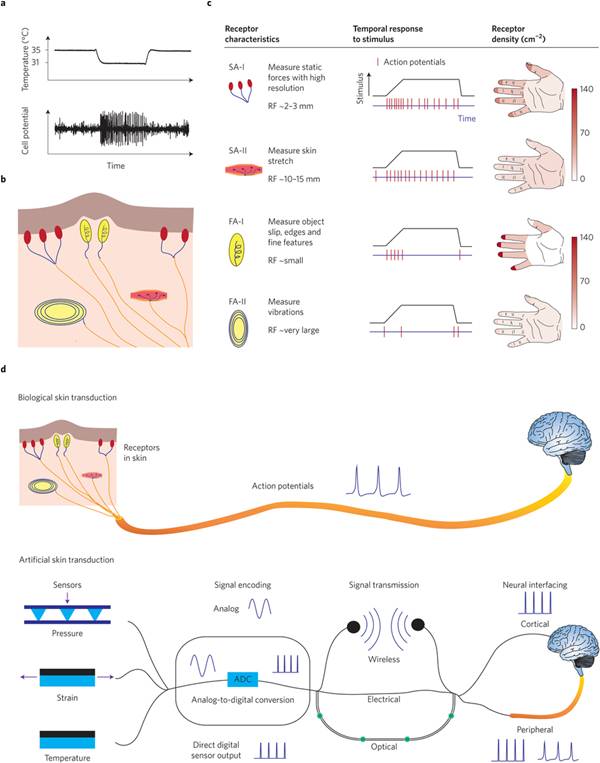 为重建接触自然感知,理解和模仿生物皮肤中影响感知性能的关键因素尤为重要。人体皮肤中的感应接收器主要为以下七种:疼痛感受器、冷感受器、暖感受器和四种机械刺激感受器。皮肤中的接收器可以记录时间与电压峰值的关系,即动作电位,使人体可以感知不同的温度。而四种机械感受器可以在不同时间尺度和空间尺度测量作用力,其中慢适应受体(SA-I和SA-II)对静态压力产生响应,而快适应受体(FA-I和FA-II)对动态压力(压力对时间的导数)和波动产生响应。其他复杂感应则由皮肤中的高密度多种接收器共同完成,比如表面硬度则通过皮肤受体和内部受体的综合输出信号来测量,而表面湿度的感知则是基于机械刺激接收器和热接收器的共同作用。传统电子器件不能满足对皮肤综合机械性能和感知性能的模仿,因此开发新材料新技术来实现皮肤中感受器、信号编码、信号传输和与神经系统间的接口尤为重要。