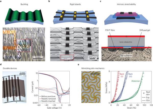皮肤通过弯曲和拉伸适应身体运动的能力不能通过传统的刚性硅基器件来实现。而柔性电子器件则可在曲面上实现弯曲和拉伸等行为,柔性基底加工过程简单也可以降低制造成本。然而若要完全模仿皮肤的感知功能,我们需要材料具有很低的弹性模量和很好的可拉伸性。本文将讨论三种实现可拉伸电子器件的主要途径:(1)柔性器件的屈曲;(2)引入非连续刚性元件;(3)利用本征柔性材料。