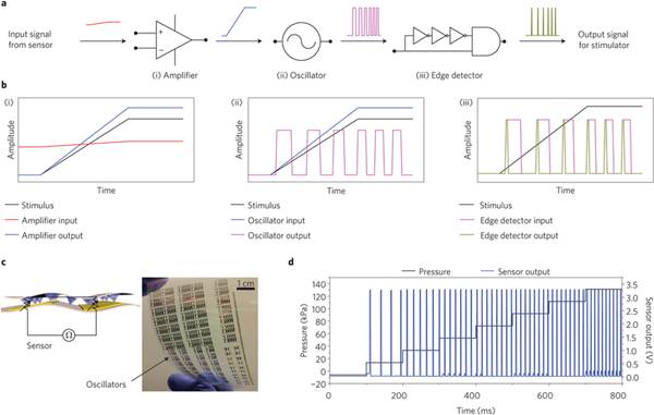 模拟脉冲的振幅控制感觉的形成的感应区域的大小,因此需要引入放大器来放大传感阵列记录的信号。研究者们利用不同的方法构建了柔性放大器,比如将硅薄膜或图案化的有机半导体转移到柔性基底上并将它们连接成互补金属氧化物半导体结构,并通过调节脉冲的频率、波形和周期等来调节输出信号强度。