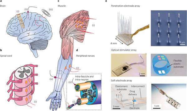 在病人长期持续的动作后,植入电极或光学器件与中枢神经系统间仍能保持稳定坚固的界面接触是义肢电子皮肤应用的关键部分。最近研究者利用柔性电子元件设计来实现其与神经系统间长期稳定的界面接触。这使得植入电子元件与神经系统具有相似的机械性能以减少神经元损伤和电子元件外围伤疤组织的形成。另外,研究者也提出无线植入电子器件,用于实现器件与自由活动生物中枢和边缘神经系统的连接。